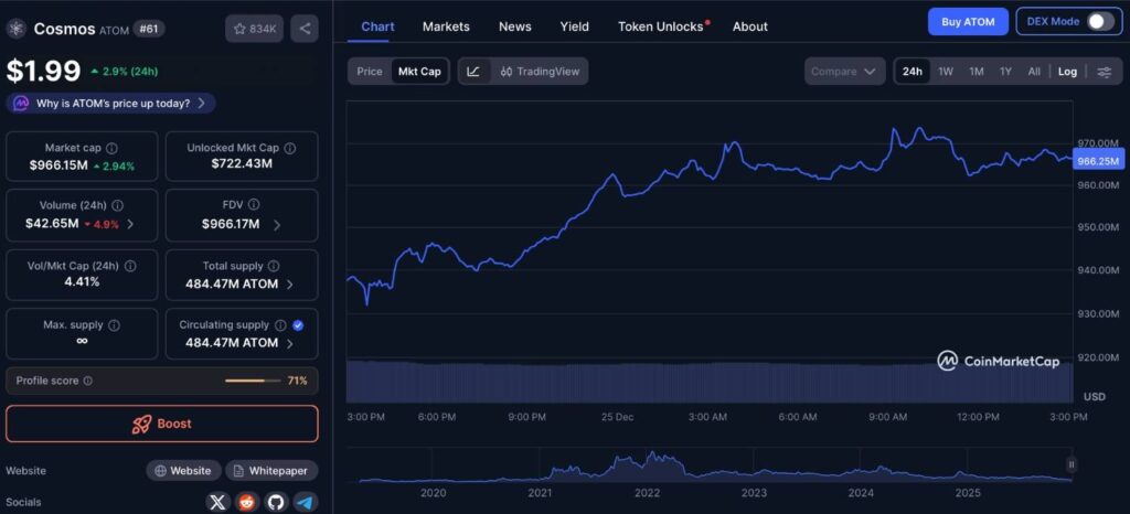 Cosmos (ATOM) is approaching the $1 billion market cap mark from a fundamentally different angle. ATOM rose just over 3% in the past 24 hours, outperforming the broader crypto market, and currently sits near a $966 million valuation. While still down nearly 19% over the past 30 days, recent developments suggest improving medium-term fundamentals.