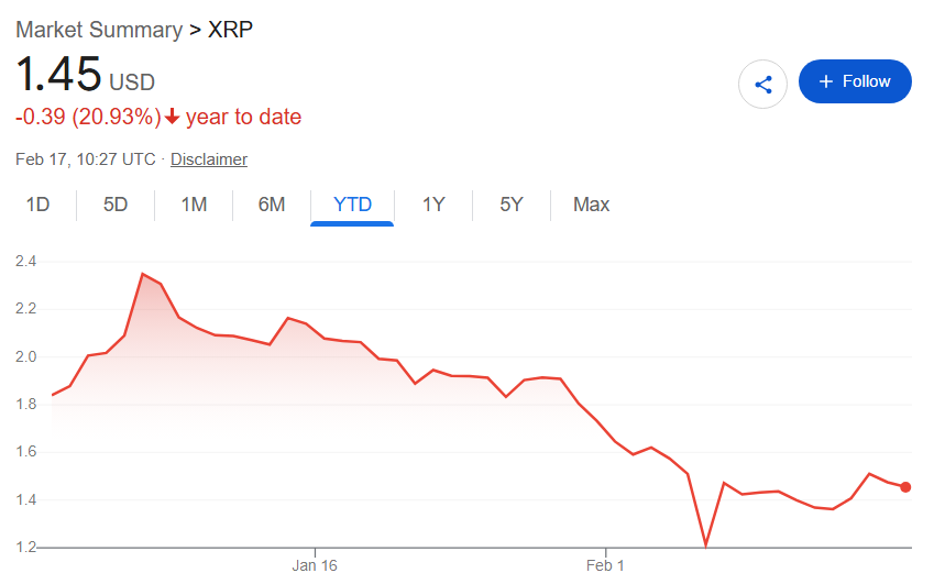 Still, it is notable that, as drastic as a 65% price target cut is, Standard Chartered remains surprisingly bullish about XRP. At press time on February 17, the token was changing hands at $1.45, meaning that the updated forecast for a $2.80 year’s end price still indicates a 91% rally is anticipated.