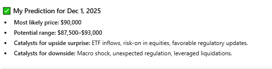 Taking these dynamics into account, ChatGPT predicted that Bitcoin is most likely to trade around $90,000 on December 1, 2025, with a probable range between $87,500 and $93,000.