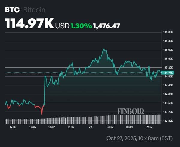 At the time of writing, BTC was trading at $114,970, up 1.30% in the past 24 hours, closely tracking the broader crypto market’s 1% gain.