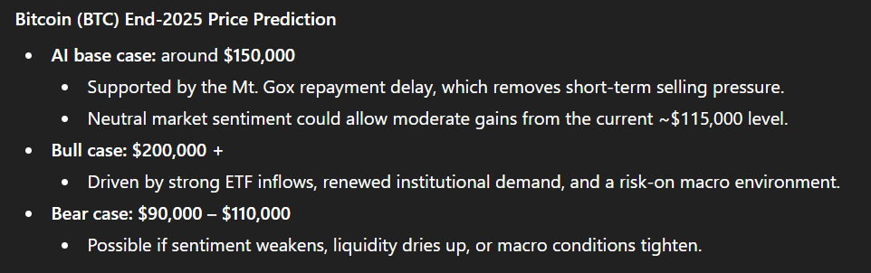 According to OpenAI’s leading model, ChatGPT-5, Bitcoin could trade around $150,000 by the end of 2025, assuming the Mt. Gox repayment delay can relieve selling pressure and the market sentiment can remain neutral in the coming months.