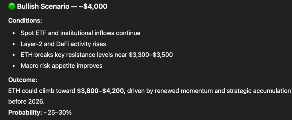 ChatGPT’s analysis also outlined a bullish scenario that places Ethereum closer to the $4,000 mark by the start of 2026. This outcome is tied to sustained institutional and spot ETF inflows, rising activity across layer-2 networks and decentralized finance, and a decisive break above resistance in the $3,300 to $3,500 zone.