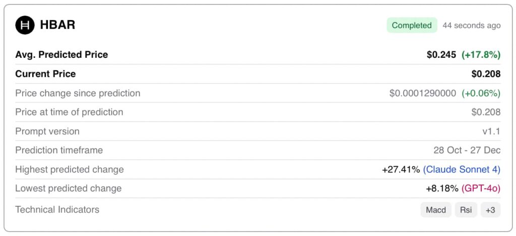 In parallel with the ETF launch, Finbold’s AI prediction agent, powered by models including Claude Sonnet 4 and GPT-4o, has issued a 60-day outlook for HBAR. The system projects an average price of $0.245, implying a potential gain of about 17.8% from current levels.