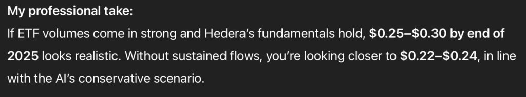 Meanwhile, separately asked ChatGPT-5 forecasted that if ETF volumes build steadily and Hedera’s fundamentals remain intact, a move into the $0.25–$0.30 zone by the end of 2025 looks realistic.