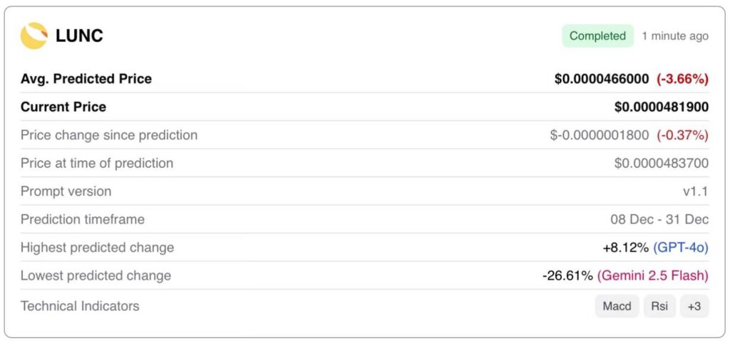 However, not all LLMs were uniform in their prediction. On the bullish end, ChatGPT envisions Terra Classic rising another 8.12% to $0.00005230, while Claude Sonnet 4 sees it going up 7.91% to $0.00005200. These two scenarios would allow the asset to nearly double in value in the span of about a month, as it was changing hands at about $0.00002570 on December 1.