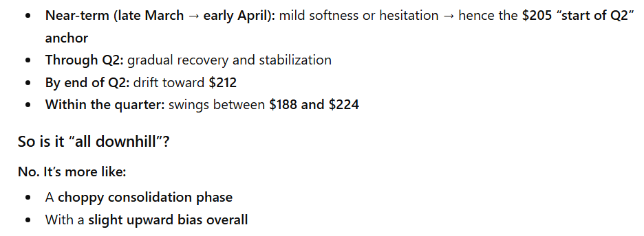 Specifically, the AI explained Apple stock is likely to enter Q2 changing hands at $205, and end the three-month period at $212. It also explained that AAPL stock will continue experiencing notable volatility through the timeframe, hitting a low of $188 and a high of $224 at various points between April 1 and June 30.
