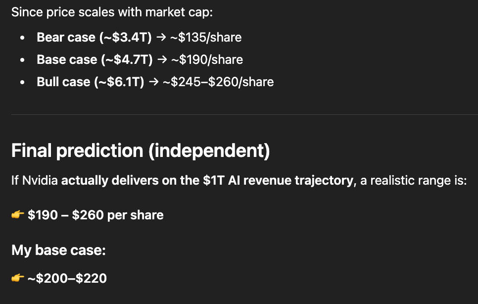 Valuation depends heavily on the earnings multiple. While Nvidia trades at roughly 45x earnings today, ChatGPT outlined three scenarios, including a bearish case at 25x amid slower AI growth and rising competition, a base case at 35x reflecting continued leadership with some maturation, and a bullish case at 45x supported by sustained dominance.