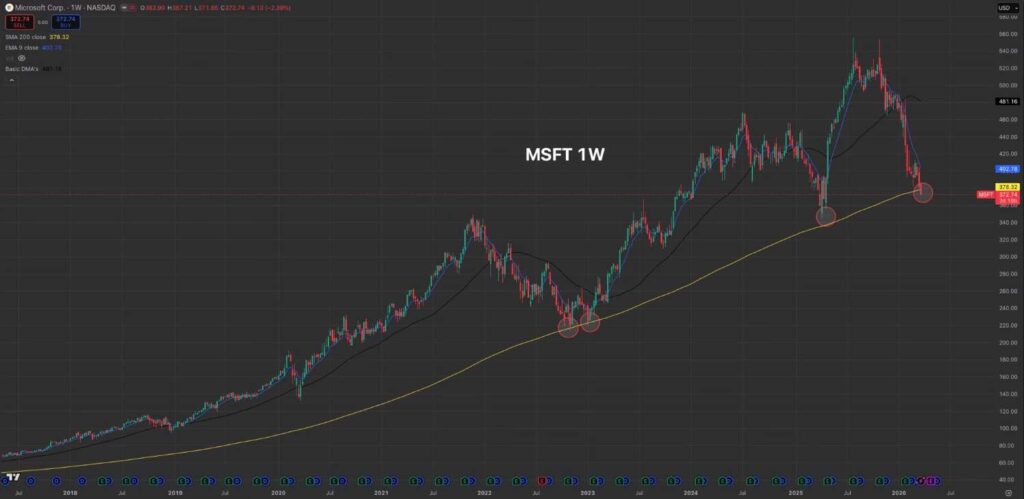 “Over the last decade, MSFT has tested its 200SMA just 3 times, & today is one of them. Currently down -31% from all time highs, $MSFT is trading at its lowest valuation since 2018. The RSI reading on $MSFT is now close to 2008 levels with a forward P/E of just 20x. A generational buying opportunity here. Don’t miss it…,” Mike Investing wrote on X.
