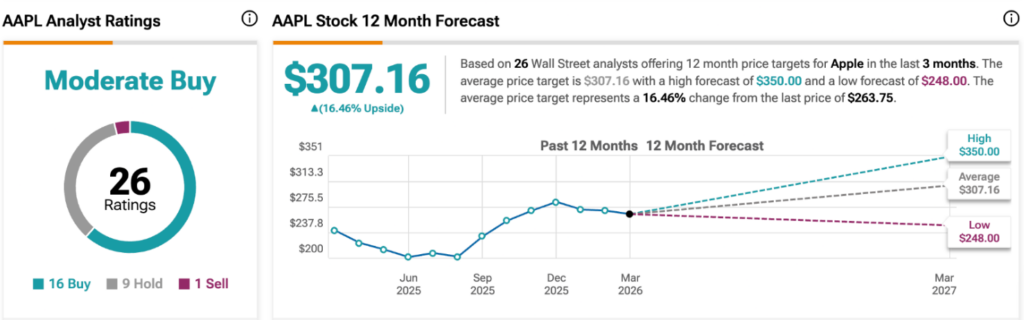 Overall, though, Wall Street remains bullish on Apple. With the latest Barclays price target, the consensus on TipRanks at the time of writing, based on 26 analysts, stands at $307.16, implying potential upside of about 16.5% from the latest closing price.