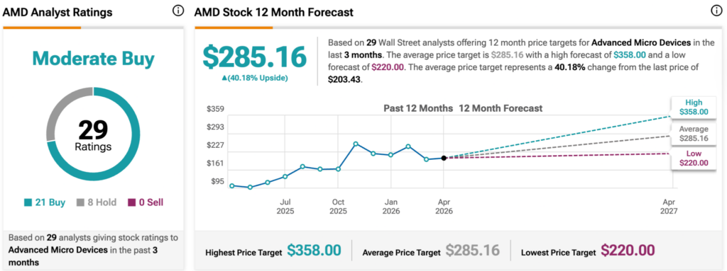 Based on this outlook, AMD has an average price target of $285.16, implying a potential upside of about 40%. The highest target is set at $358, and the lowest at $220.