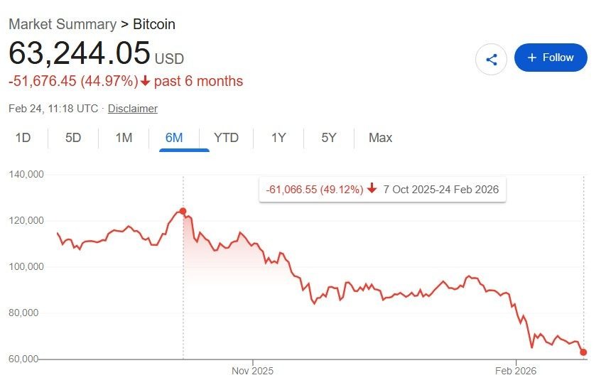 The 2026 wipeout extends a downturn that began late last year. After surging to a new all-time high above $125,000 in October 2025 amid a powerful bull market, Bitcoin reversed sharply. By February 24, 2026, BTC had corrected by roughly 50% from its peak.