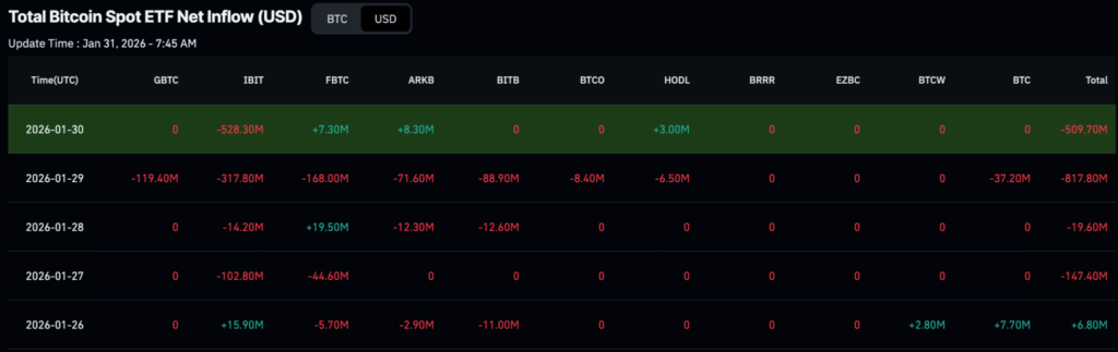 The most intense Bitcoin selling occurred toward the end of the week. On January 29, IBIT recorded net outflows of roughly $318 million, followed by an even larger $528 million exit the next day.