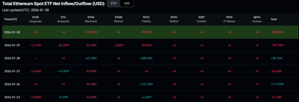 Ethereum mirrored this pattern, though on a smaller scale. ETHA experienced steady selling throughout the week, culminating in a significant $157 million outflow on January 30 after already shedding nearly $55 million the previous day.
