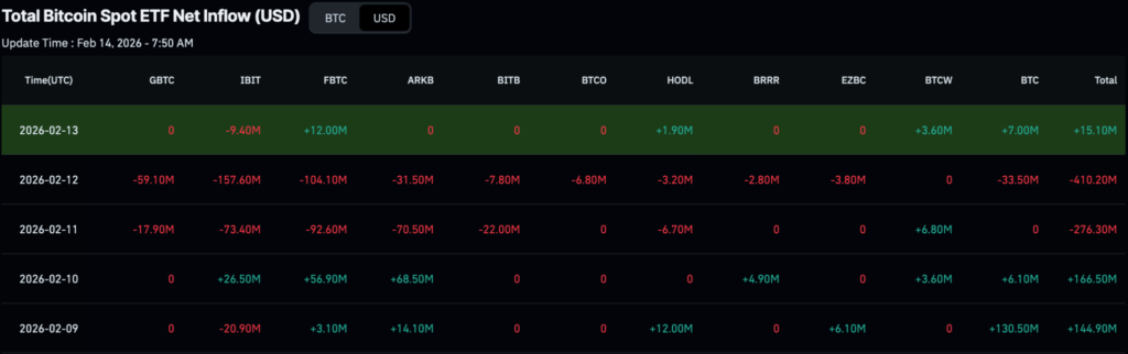 The bulk of the selling pressure was concentrated midweek. On February 12 alone, the fund saw $157.60 million in outflows, marking the largest single-day decline during the period.