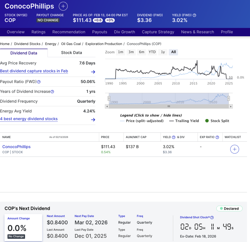 As of the close of the last Friday session, COP was trading at $111.43. The stock carries a forward annual dividend of $3.36 per share, translating to a yield of 3.02%. Its forward payout ratio stands at 50.06%, a moderate level for an energy producer that reflects a balance between reinvestment in production assets and returning capital to shareholders.