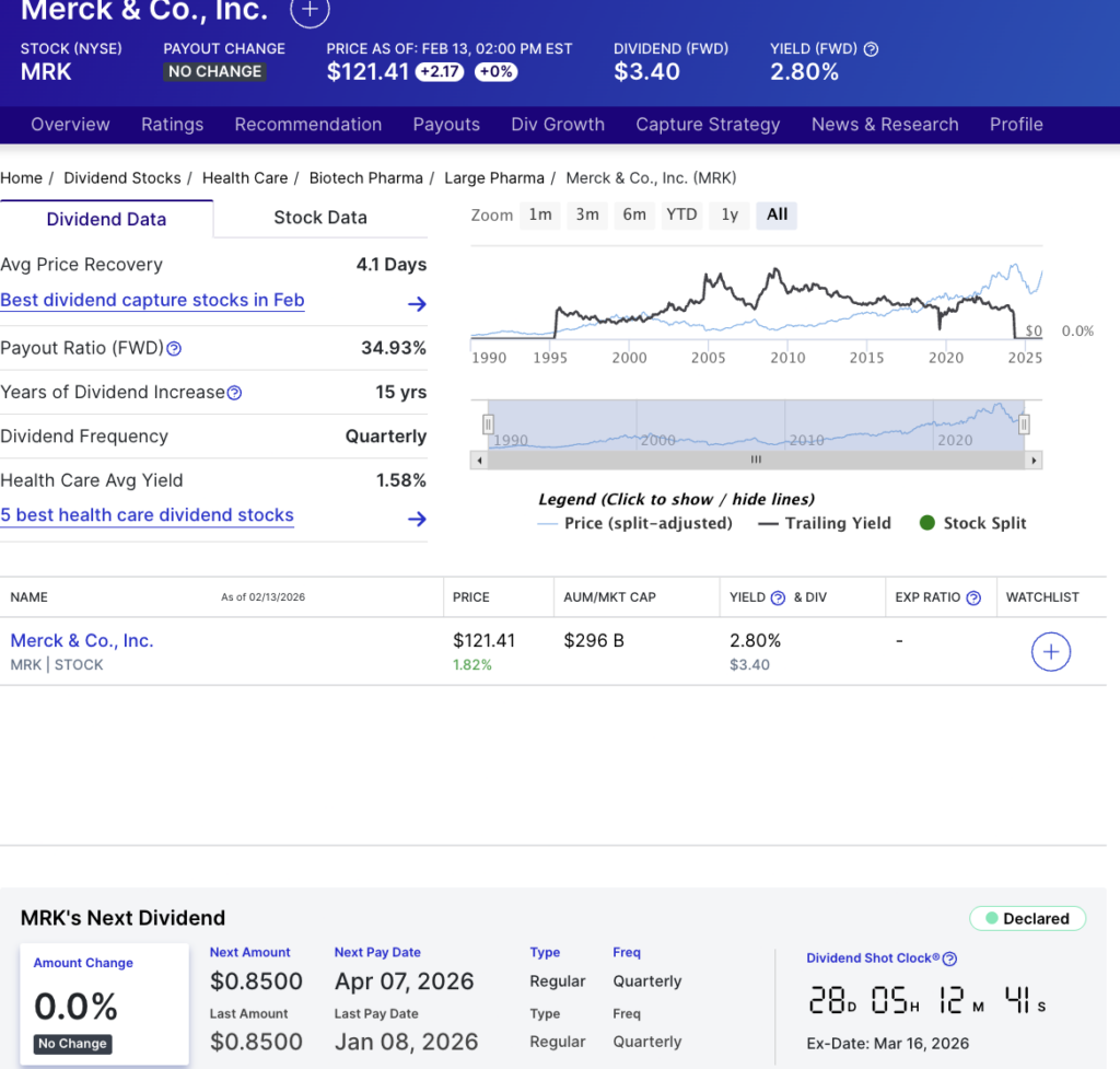 Merck (NYSE: MRK) enters 2026 as one of the more defensively positioned dividend names in the healthcare space. As of press time, the stock was trading at $121 and offers a forward dividend of $3.40 per share, translating to a yield of 2.80%.