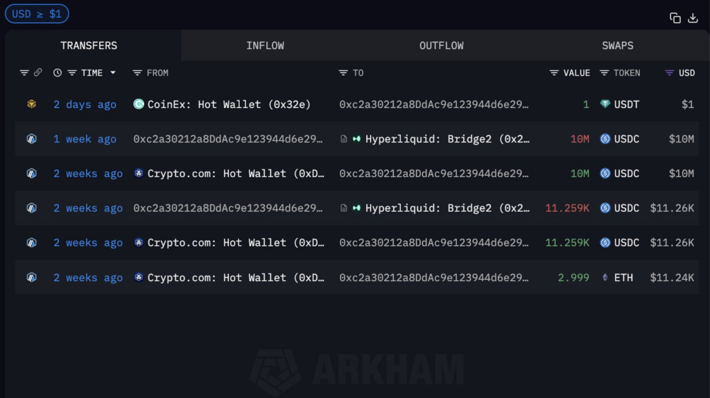Two weeks ago, the trader received multiple inflows from Crypto.com’s hot wallet, totaling over $20 million in USDC and ETH. Shortly after, substantial transfers were made to Hyperliquid’s Bridge2, suggesting capital deployment into leveraged trading positions.
