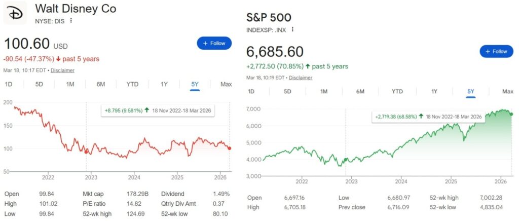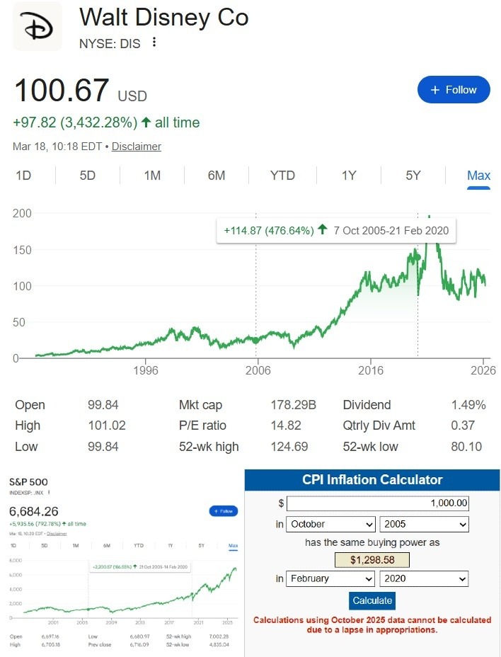 Along with the broader stock market significantly outperforming the firm with a 70.85% rally for the benchmark S&P 500 index within the same timeframe, the heightened inflation of the era means that Disney shareholders would, in fact, be worse for wear by 2026.