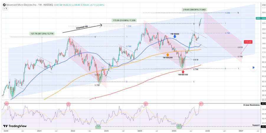 The analysis noted that AMD’s six-year bullish channel is now nearing exhaustion, with the stock trading near the upper boundary, a level that previously triggered significant corrections. On the weekly chart, AMD remains well above its 50-week MA at $171.30 and 200-week MA at $138.50, indicating stretched conditions.