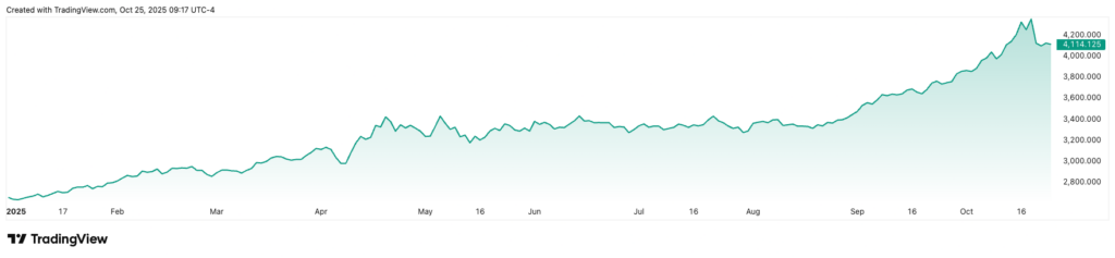 Notably, gold has been among the best-performing assets of 2025, with investors turning to the precious metal for its safe-haven appeal. However, in recent weeks, the metal has recorded significant outflows, trading at $4,114 as of press time, up more than 56% year to date.