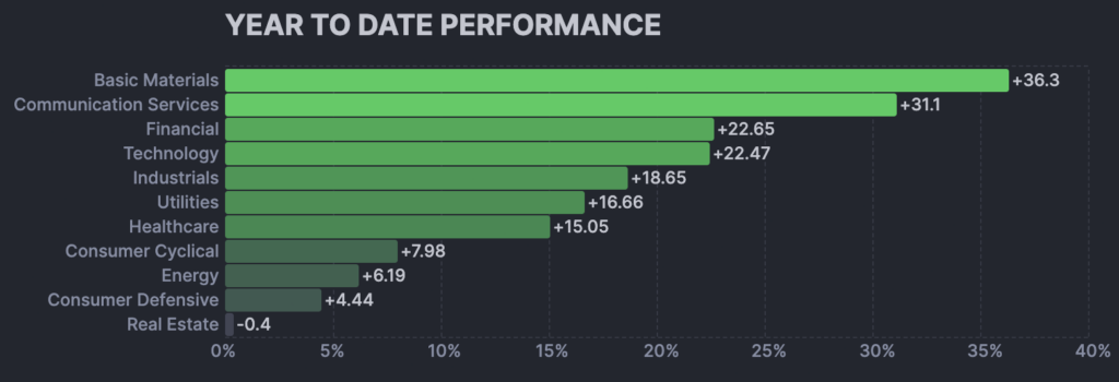 In contrast to real estate’s slight decline, the top-performing sectors posted robust results. Basic materials led the market with a gain of roughly 36.3%, followed by communication services at about 31.1%.