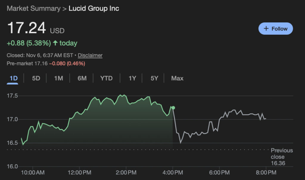 Lucid Motors (NASDAQ: LCID) closed the session more than 5% higher, trading near $17.24, even as the company reported a deeper quarterly loss and revenue below expectations.