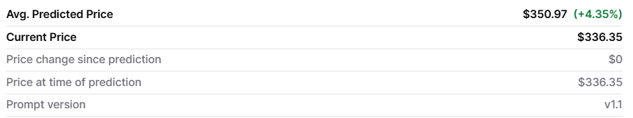 Interestingly, Claude Opus 4.6 and Gemini 3 Flash made the exact same forecast and set their sights at $348.50 following a 3.61% rise.