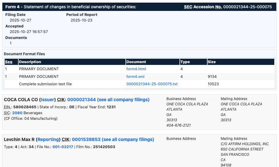 Coca-Cola (NYSE: KO), one of Warren Buffett’s largest and longest-held investments, has seen notable insider activity involving director Max Levchin.