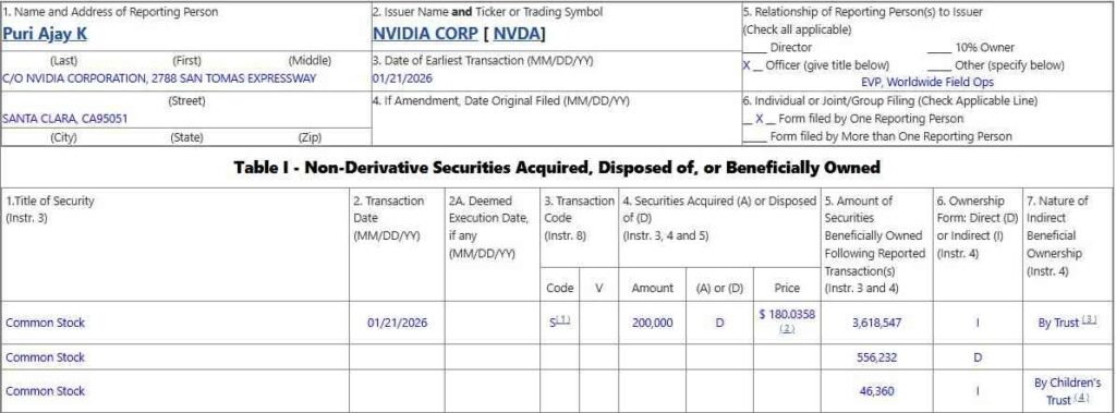Interestingly, a single senior officer with the company, Jay Puri, the executive vice president of Worldwide Field Operations, is responsible for approximately 70% of the sales executed so far. Out of the total of $106 million of NVDA stock sold, the EVP offloaded more than $73 million across two filings on January 9 and January 23.