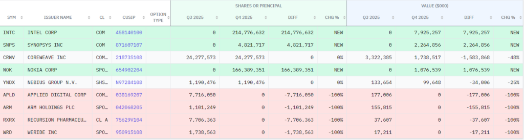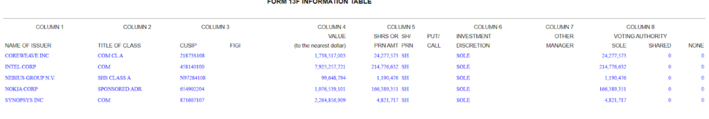 The ownership of 24 million Coreweave (NASDAQ: CRWV) and 1.2 million Nebius Group NV (NASDAQ: NBIS) shares remained entirely unchanged.