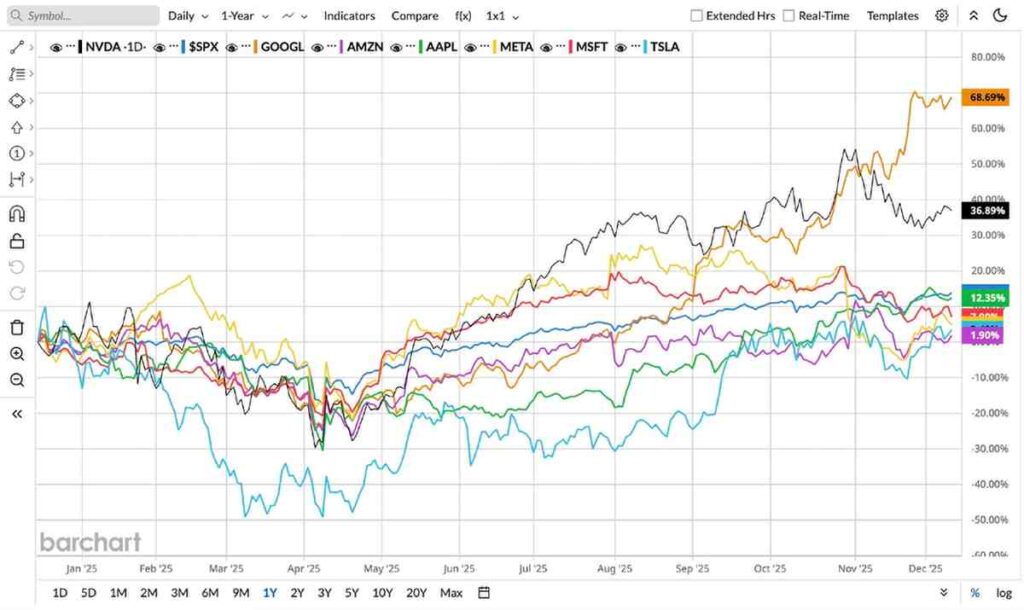 S&P 500 vs. the Magnificent 7. Source: Barchart