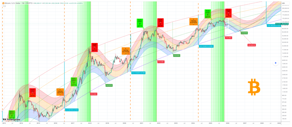 At the same time, the rainbow cycle chart supports this view by aligning price action with halving events and Fibonacci time extensions. The next major time target is the 4.618 Fibonacci extension in the final week of September 2026, a zone that has previously marked cycle lows. At that point, the model projects Bitcoin trading around $60,000, a sharp decline from cycle highs but still consistent with its long-term uptrend.