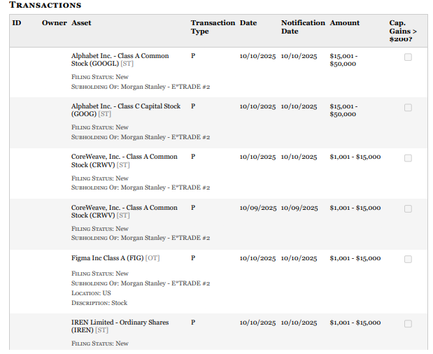 According to his disclosure, Fields purchased shares in several major technology companies earlier in October. The trades include Alphabet Class A and Class C (NASDAQ: GOOGL, GOOG), each worth between $15,001 and $50,000; Palantir Technologies (NASDAQ: PLTR) in the same range; and smaller but strategically notable investments in CoreWeave (NASDAQ: CRWV), Figma (NYSE: FIG), and Iris Energy (NASDAQ: IREN), each valued between $1,001 and $15,000. Fields reported no stock sales during this period.