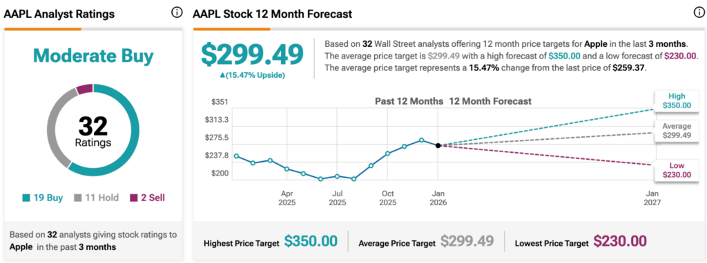 On the stock outlook, analysts remain cautiously optimistic. Specifically, based on 32 ratings tracked by TipRanks, Apple holds a ‘Moderate Buy’ consensus. Nineteen analysts rate the stock a buy, 11 recommend holding, and two suggest selling. The average 12-month price target is $299.49, implying upside of about 15% from current levels. Targets range from a high of $350 to a low of $230.