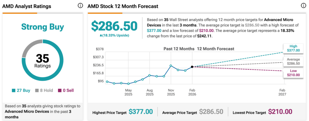 Following the earnings report, Wall Street analysts remain cautiously optimistic on AMD shares. According to TipRanks, the stock carries a Strong Buy rating based on 35 analyst reviews.