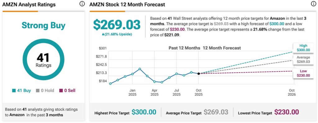 Consensus across Wall Street remains strongly positive. Data compiled by TipRanks shows that over the past three months, 41 analysts have issued price targets on Amazon with an average 12-month forecast of $269.03, implying an upside of more than 21% from current levels.