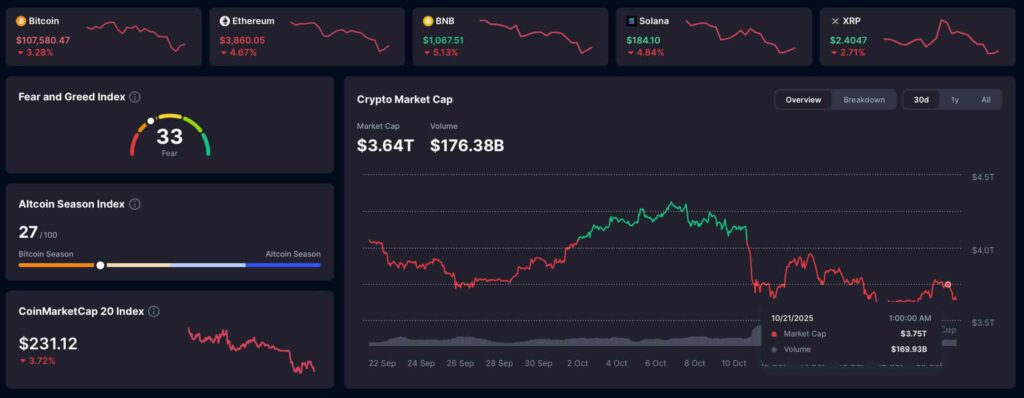 The cryptocurrency market faced a brutal sell-off on October 21, with over $110 billion in market value wiped out in a matter of hours. The total market cap plunged from around $3.75 trillion to $3.64 trillion, as panic selling swept across both Bitcoin (BTC) and major altcoins.