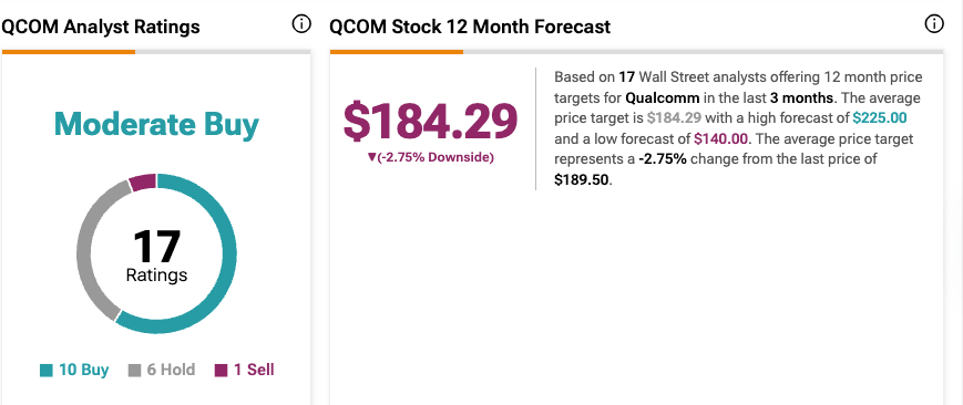Meanwhile, analysts over at Wall Street are projecting the stock may face a short-term correction in the next 12 months. Consensus from 17 analysts tracked by TipRanks shows a ‘Moderate Buy’ rating for QCOM.