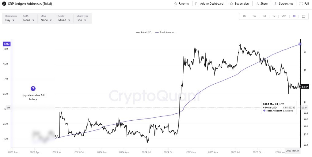 The notable growth in XRPL transactions per ledger has coincided with the ongoing mainstream adoption of the network as a cross-border payment rail. Specifically, the number of XRP Ledger addresses as of March 24, 2026, stood at approximately 8,170,693, up significantly from 4,866,823 accounts recorded on March 25, 2023, as per data shared by CryptoQuant, an on-chain analytics platform.
