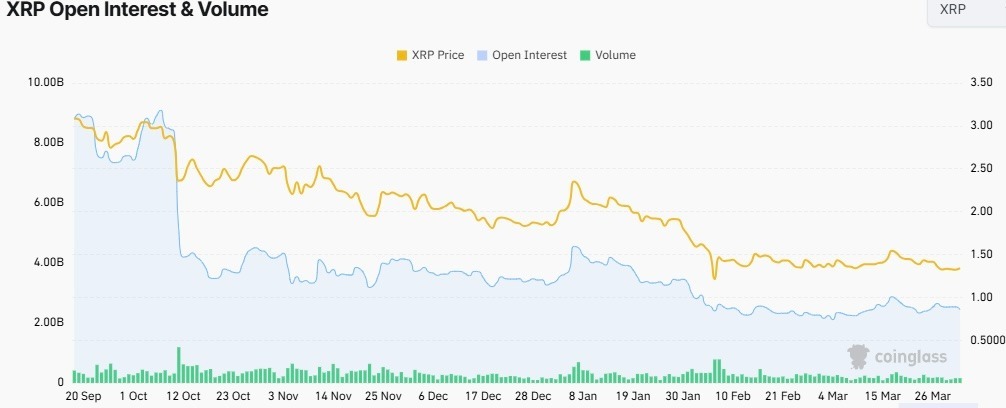 Additionally, the XRP’s Open Interest (OI), a figure that shows the total value of active contracts still held by market participants across all exchanges, has declined by over 73% in the past two quarters to hover around $2.45 billion at the time of reporting.